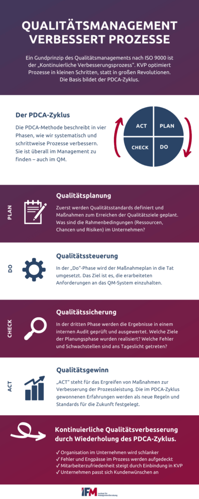 Durch die gezielte Prozessplanung und -steuerung entstehen Regeln und Strukturen im Unternehmen, mit denen die Qualität plan-, steuer- und wiederholbar wird. Prozess- und Kundenorientierung sowie die kontinuierliche Verbesserung genießen daher im Qualitätsmanagement eine große Bedeutung.